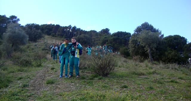 Los dos grupos de 3º de E.S.O. han realizado en la jornada de hoy (jueves 10 de marzo) una actividad organizada por los Departamentos de Biología y de Geografía y que tenía como objetivo el conocimiento del Parque Natural Montes de Málaga. Salimos a las 9 desde el Colegio para visitar en primer lugar el Lagar de Torrijos, espacio preservado para descubrir un tipo de hábitat rural característico de esta zona y que tuvo vigencia hasta el siglo pasado. Desde allí iniciamos una ruta de 11 km. que hubo que detallar sobre el plano de la zona como práctica de Geografía. Las paradas en las ruinas de Santillana y en el Mirador de Martínez Farelo nos dieron otras perspectivas de esa joya que es el Parque Natural de los Montes de Málaga, tan cercano a nuestra capital y tan distinto en un día laboral a la imagen que presenta en los días festivos. También nos ha permitido conocer a personas que han convertido su pasión por la naturaleza en su forma de vida, como la monitora del Lagar de Torrijos, o los bomberos forestales que realizaban trabajos de mantenimiento en las los senderos del parque.