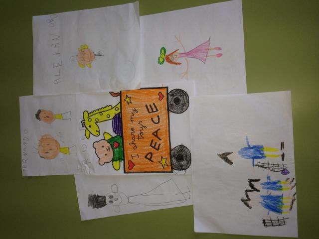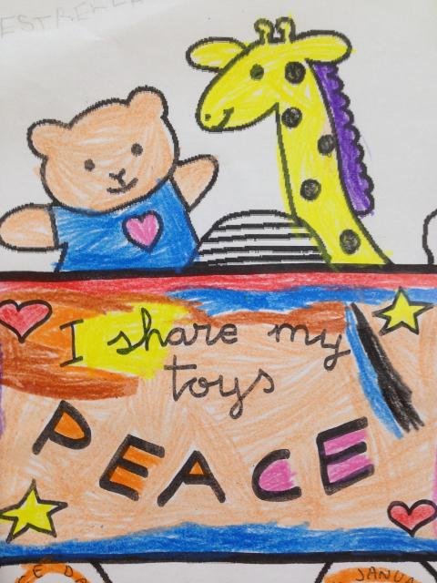 A brainstorm brought up ideas and actions we can take to build PEACE at school: share our toys, not to fight, say thank you with a smile, be friendly,…