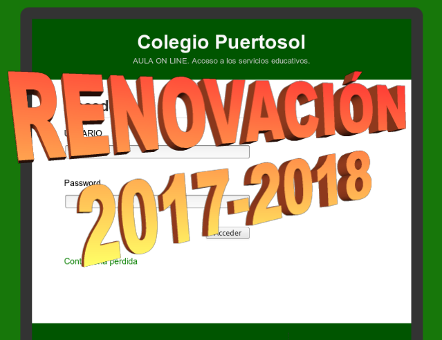 Desde estos momentos y hasta el jueves día 8 de junio, a través de «Aula on line», se ha habilitado el formulario por el que se puede realizar la renovación de plazas del próximo curso 2017-2018 . Este trámite se puede realizar de manera rápida, cómoda y desde casa, sin necesidad de tener que acudir al centro.