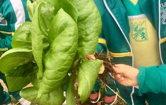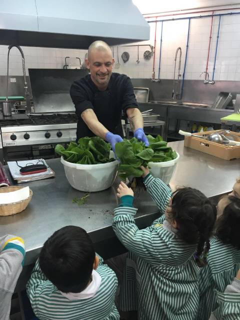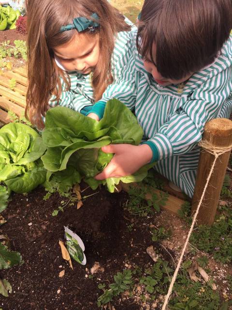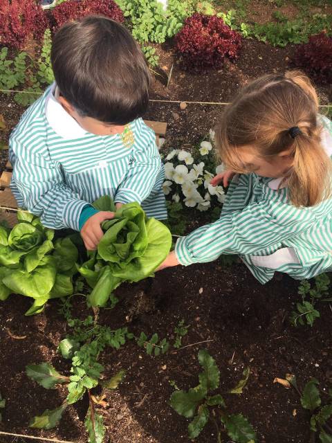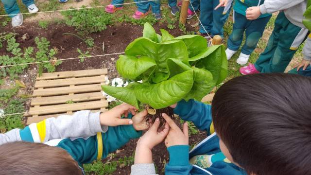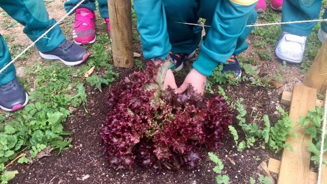 Los alumnos/as de 3 y 4 años de Educación Infantil recolectamos 2 tipos de lechugas de nuestro huerto ecológico y se las damos al cocinero del cole para que nos haga una rica ensalada.