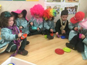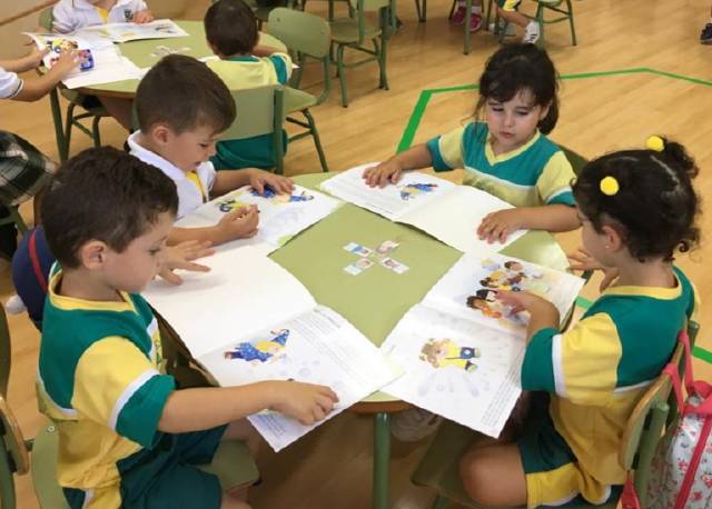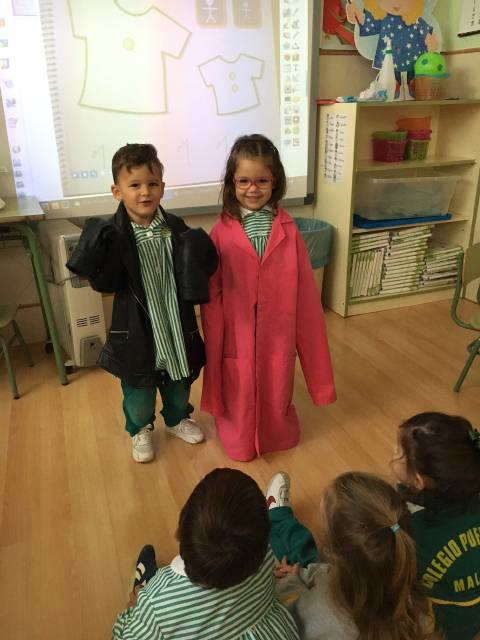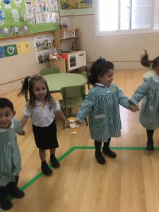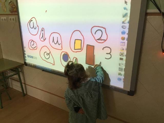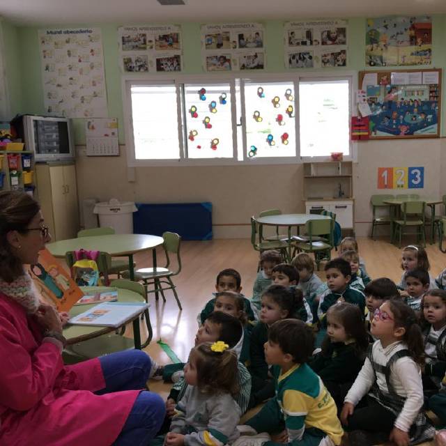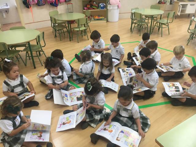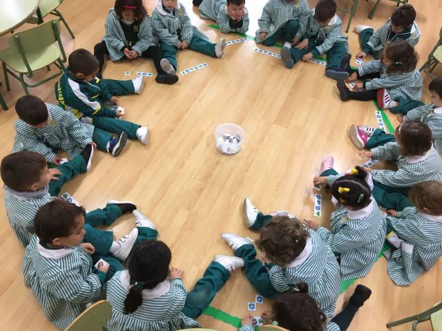 Contamos cuentos, hacemos series con el material manipulativo , celebramos el cumpleaños de nuestra mascota,trabajamos el concepto grande/pequeño con objetos de nuestro entorno,juegos simbólicos,repasamos conceptos en la pizarra digital…..