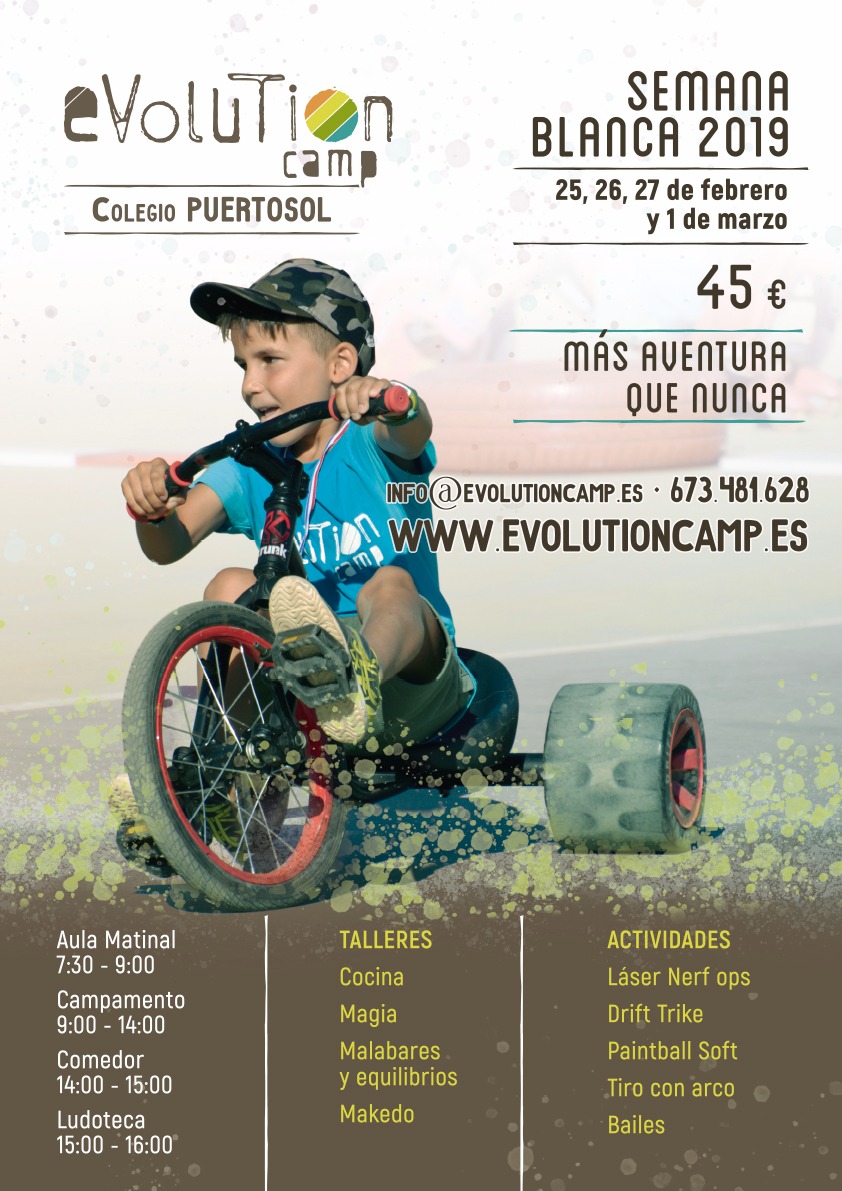 Les informamos que hoy día 1 de febrero de 2019 comienzan las inscripciones para el campamento de Semana Blanca Evolution Camp Colegio PUERTOSOL.