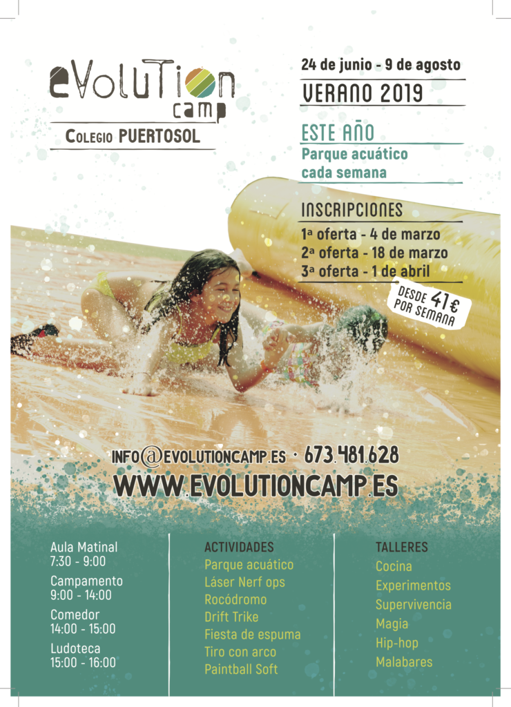 Les informamos que hoy comienzan las inscripciones para el campamento de verano Evolution Camp PUERTOSOL. Podrán beneficiarse de las diferentes ofertas que se ofrecen (descuentos por pronto pago, descuentos familiares,…)