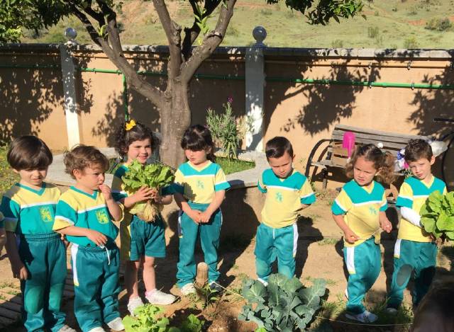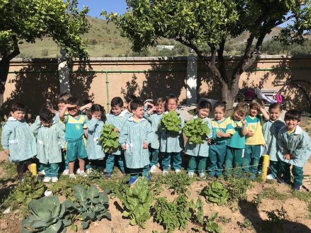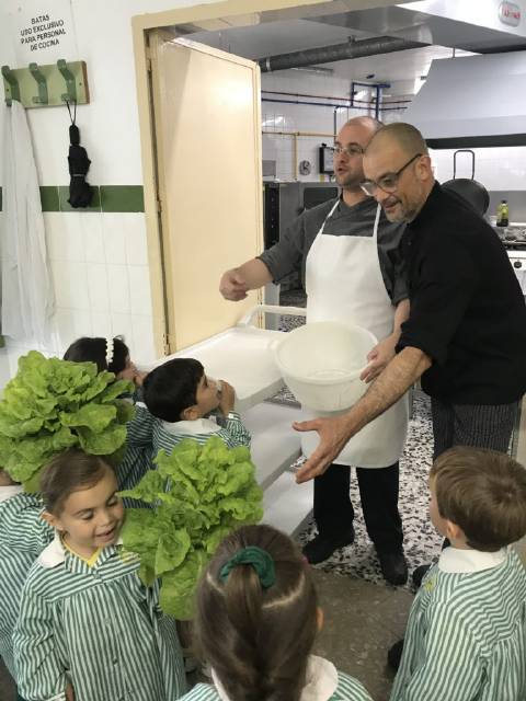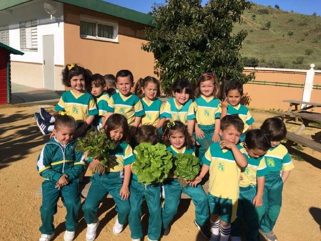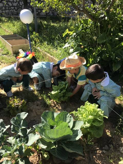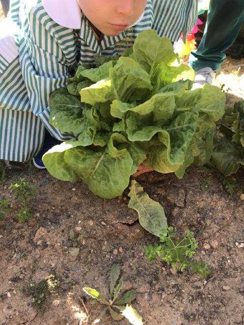 El alumnado de 3 años de Educación Infantil recolecta las lechugas que han crecido en nuestro huerto y se las llevan al cocinero del cole para que haga una rica ensalada.