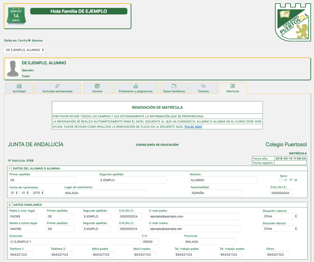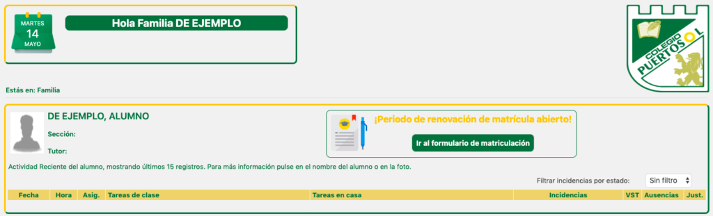 Entrando en el aula online con un usuario de familia (faxxxx), aparecerá un botón junto a los datos del alumno como se muestra en la siguiente imagen.