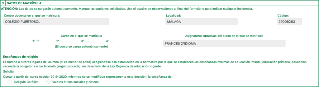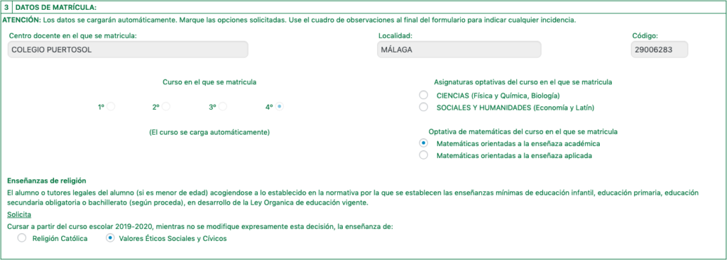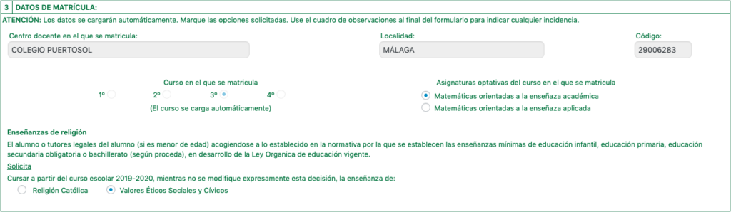 El curso en el que se matricula es seleccionado automáticamente, deben seleccionar las optativas de modalidad que desee, así como la optativa de Matemáticas preferida. Se recomienda seleccionar Matemáticas B en el caso de que vayan a estudiar cualquier modalidad de Bachillerato y solo seleccionar Matemáticas A en el caso de que vayan a realizar posteriormente algún Ciclo formativo.