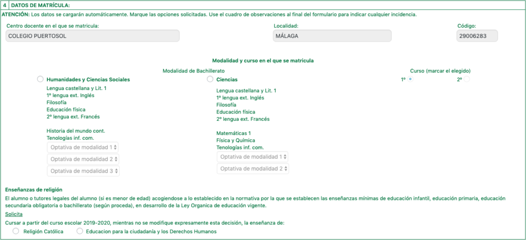 El curso en el que se matricula es seleccionado automáticamente, deberán elegir la modalidad de bachillerato que desea cursar: