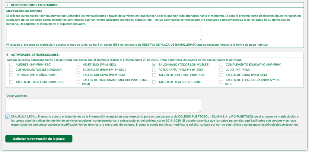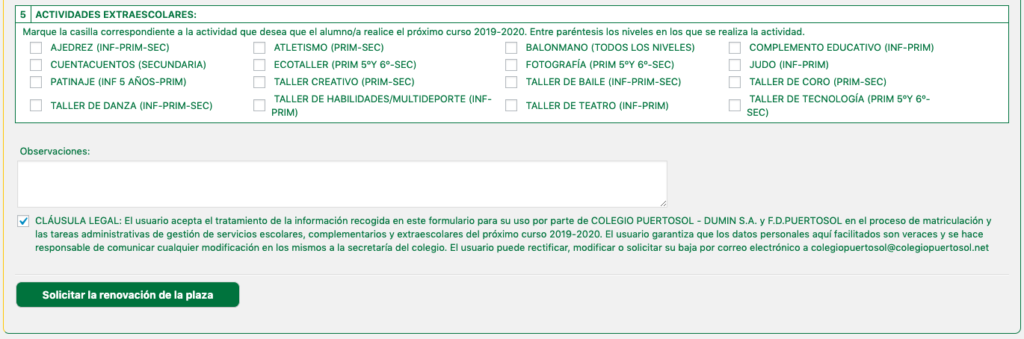 Cumplimentados todos los campos, marcamos las casilla de «Cláusula legal» y pulsamos sobre el botón «Solicitar renovación de la plaza».