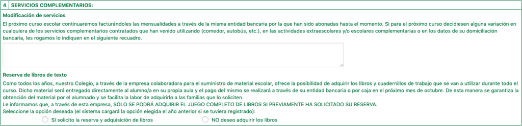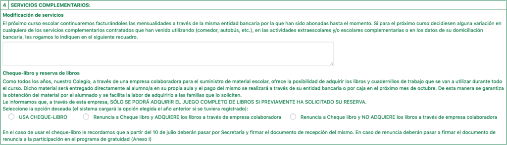 Finalizada la selección de optativas, deberán cumplimentar, si procede, las observaciones para la modificación de servicios y/o forma de pago, domiciliación, etc. También deberán seleccionar si desean o no, adquirir los libros para el próximo curso haciendo uso o no, del cheque-libro.