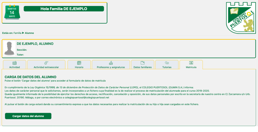 Deberán leer la información mostrada sobre política de protección de datos y pulsar sobre el botón «Cargar datos del alumno».