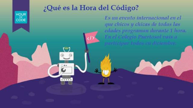 Durante las dos últimas semanas lectivas de diciembre, todo el alumnado del colegio desde Educación Infantil hasta Bachillerato, va a participar en la Hora del Código. Este movimiento global en el que participan decenas de millones de alumnos de más de 180 países, intenta fomentar el aprendizaje de la programación a edades cada vez más tempranas. Y para ello, se han seleccionado una serie de actividades y juegos adaptados al nivel del alumnado. Todo ello encaminado a que nuestro alumnado aprenda de una forma atractiva y divertida las bases del pensamiento computacional, que le van a resultar muy útiles en un mundo en permanente cambio tecnológico.