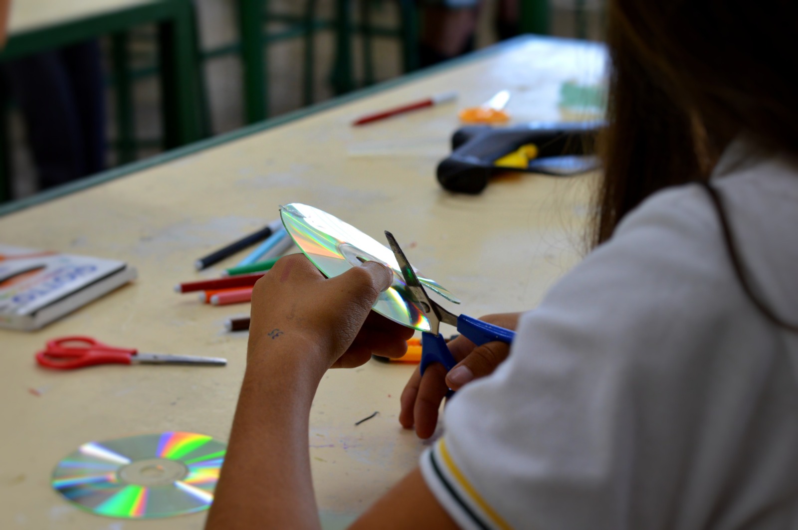 La actividad extraescolar de Ecotaller ya ha comenzado y el alumnado ha realizado su primera manualidad con materiales reciclados: CDs.Comienza el curso académico y, gracias a la labor del Ecotaller, los alumnos aprenden que todo objeto puede tener una segunda vida, fomentando así el reciclaje y el cuidado del medio ambiente. El alumnado se ha comprometido este curso a seleccionar materiales reciclables desde casa para darles uso en esta imprescindible actividad extraescolar. Con los CDs como protagonistas y piedras de la playa, éste ha sido el resultado de nuestra primera actividad en el Ecotaller: Cascadas artificiales.
