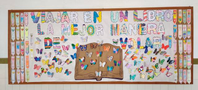 Con motivo del Día del Libro (23 de abril), el alumnado de 2º a 4º de primaria, elaboró este mural con el siguiente lema: «Viajar en un libro, la mejor manera de volar». Además de dicho mural, en clase se hizo referencia al escritor Miguel Delibes, ya que este año se cumplen 100 años de su nacimiento, con especial mención a su libro: «El príncipe destronado».