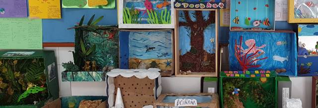 Recientemente terminó, en la zona de primaria de la planta baja, la exposición de ecosistemas realizada por los alumnos de 4º de Primaria. Durante un mes aproximadamente se ha podido disfrutar de sus producciones, que iban desde todo tipo de ecosistemas terrestres hasta los más variados ecosistemas acuáticos.