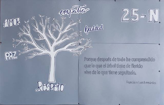 Hoy jueves 25 de noviembre celebramos el “Día Internacional contra la Violencia de Género”. Para su conmemoración, el alumnado de 3º de ESO ha participado en la lectura de un manifiesto por los buenos tratos y los alumnos/as de 1º de Bachillerato, 3º de ESO y 4º de ESO han elaborado un mural para destacar la importancia del respeto como la base para la convivencia.