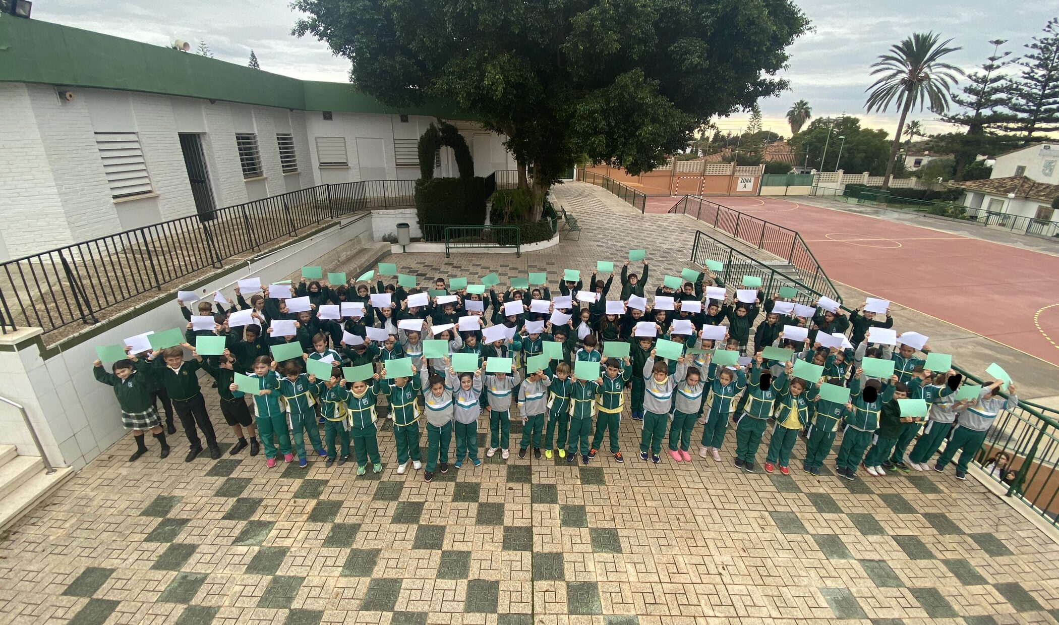 El alumnado de 3° y 4° de primaria ha querido conmemorar el Día de la bandera de Andalucía haciendo un mosaico en el patio del cole, luciendo los dos colores característicos de la bandera de nuestra Comunidad Autónoma.