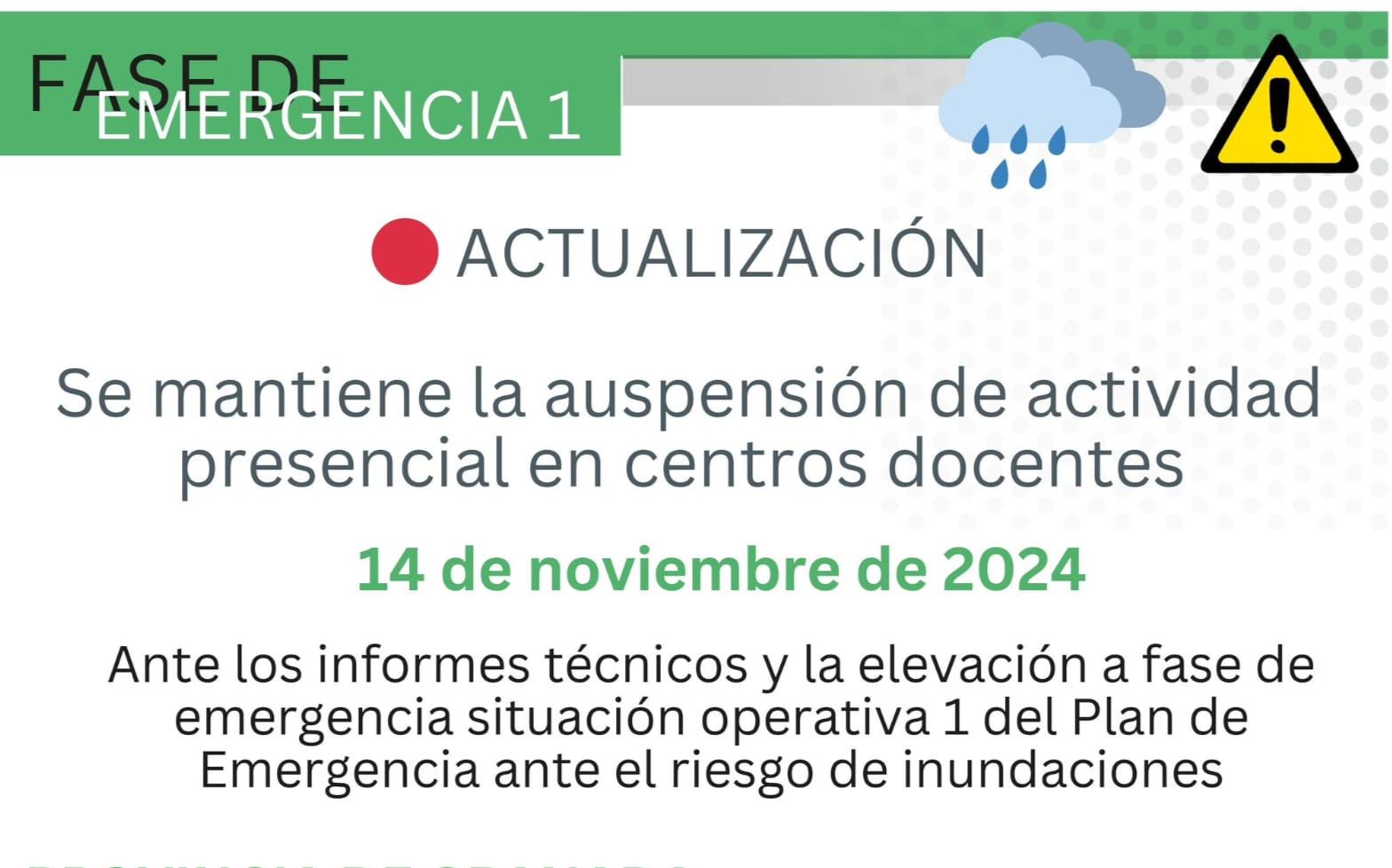 Ante los informes técnicos y permaneciendo en la fase de emergencia situación operativa 1 del Plan de Emergencia ante el riesgo de inundaciones, se les comunica que mañana día 14 de noviembre de 2024 se mantiene suspendida la actividad presencial en nuestro centro educativo, por lo que no deben desplazarse al mismo. En caso de que la suspensión deba prolongarse más allá del día 14 se les comunicará convenientemente.
