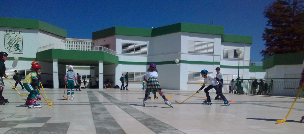 La actividad de patinaje se realiza en la terraza de nuestro centro. Allí se practican frenadas, giros, patinar de frente, de espaldas con la seguridad de las protecciones y el casco. Una vez conseguido avanzamos practicando y participando en los circuitos de habilidad de juegos deportivos municipales y mas adelante en carreras sobre patines. Aprendemos las diferentes modalidades como hockey o artístico y realizamos una coreografía a final de curso. La primera parte de la clase se aprende la técnica que luego habrá que usar en los juegos que se realizan. Juegos de equipo, cooperativos y sobre todo de desplazamiento para patinar mucho y aprender divirtiéndose.